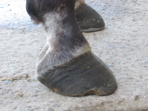 Après plusieurs ferrures avec fers à œuf ( ce qu’a mis le maréchal au final), toujours plaques de cuir et silicone, les seimes étant barrées par un point de perceuse, je décide de tenter de déferrer en septembre 2005